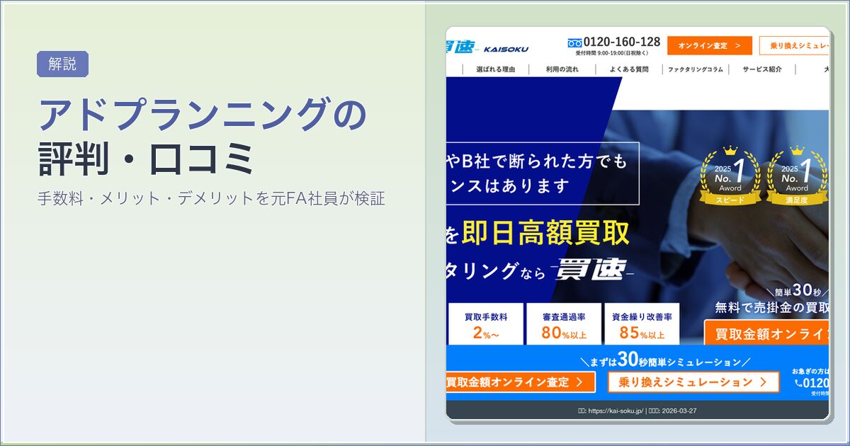 「アドプランニングのファクタリングって実際どうなの?」と気になっていませんか。買速やSoKuMoと同じ会社が運営する総合型サービスですが、口コミや評判がまとまった情報源は多くありません。