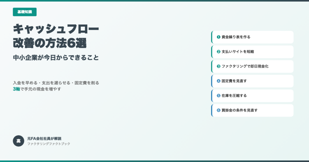 キャッシュフローを改善する6つの方法を元FA会社社員が解説。入金を早める・支出を遅らせる・固定費を削るの3軸で手元の現金を増やします。 -