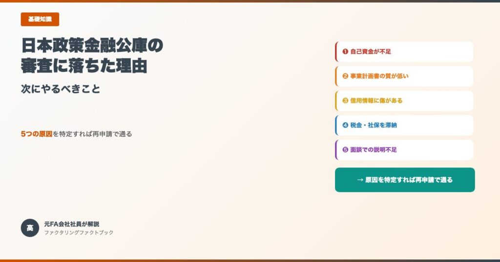 日本政策金融公庫の審査に落ちる5つの理由と再申請で通るポイントを元FA会社社員が解説。融資以外の資金調達手段も紹介します。 -