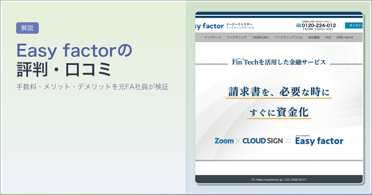 結論から言えば、イージーファクターは株式会社No.1が運営するオンライン特化型ファクタリングサービスです。ただし万能ではありません。この記事では、業界で8年間の実務経験をもつ筆者がイージーファクターのメリット・デメリット・口コミを徹底検証します。