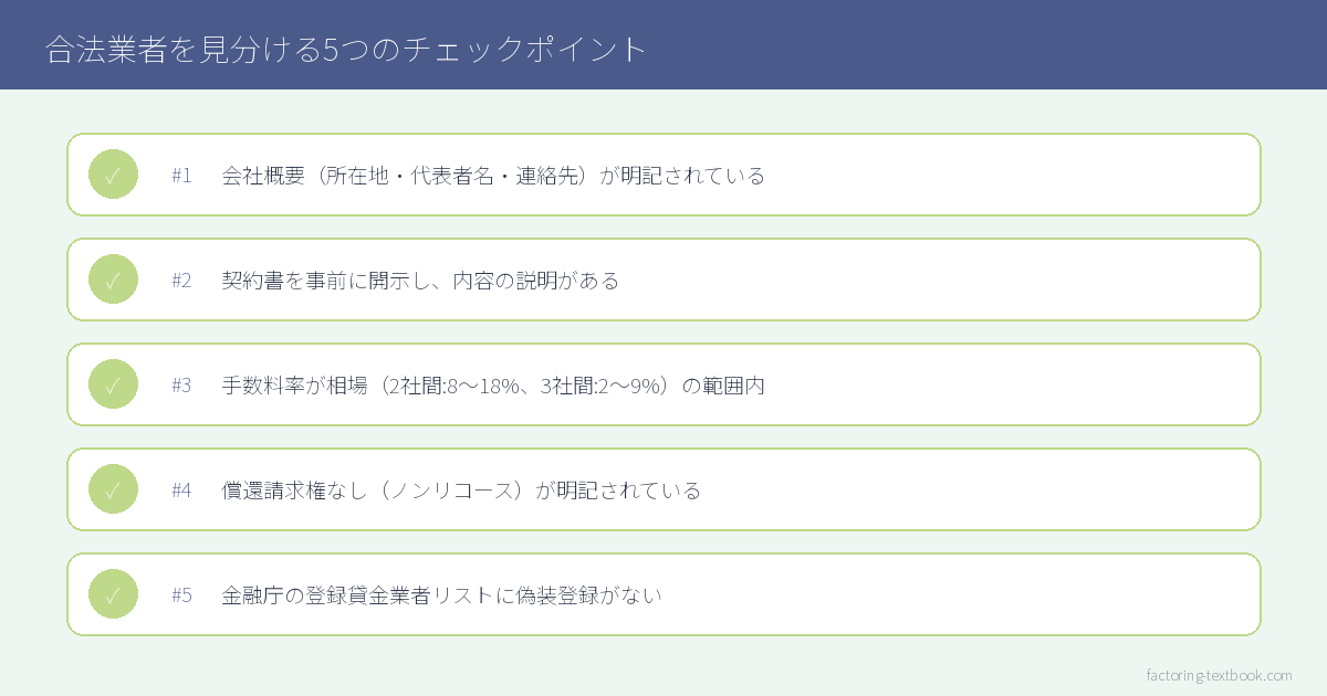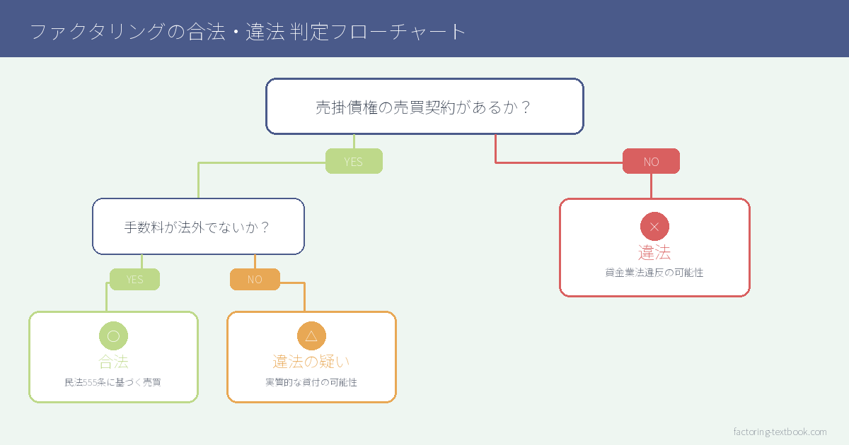 正規の売掛債権ファクタリングは合法である一方、次の条件を外れる取引には問題があると明示されています。