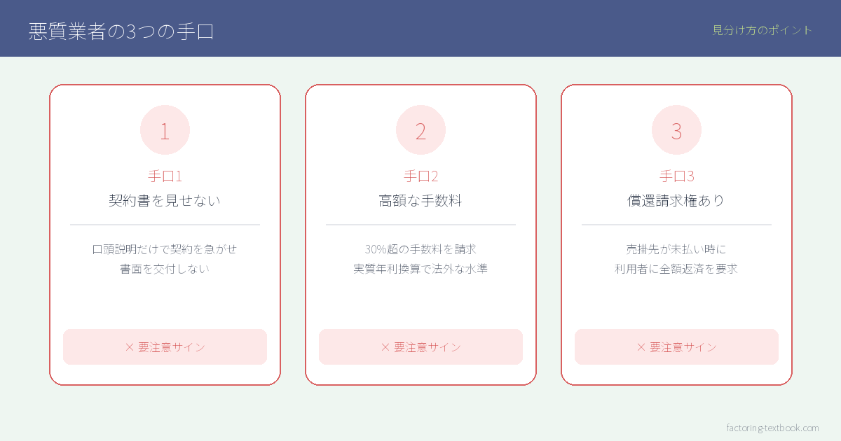 - 悪質業者の主な手口は「手数料の後出し請求」「不正な契約条項」「売掛先への強引な取り立て」の3つです