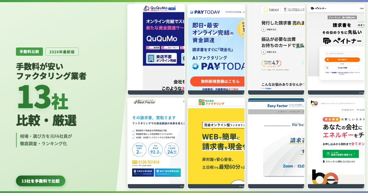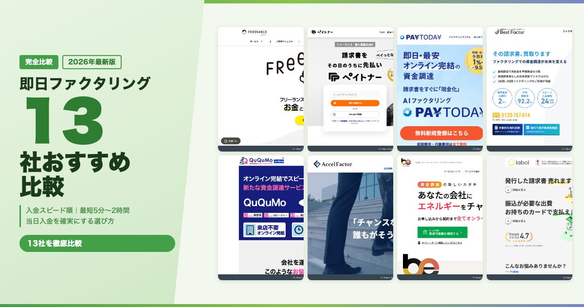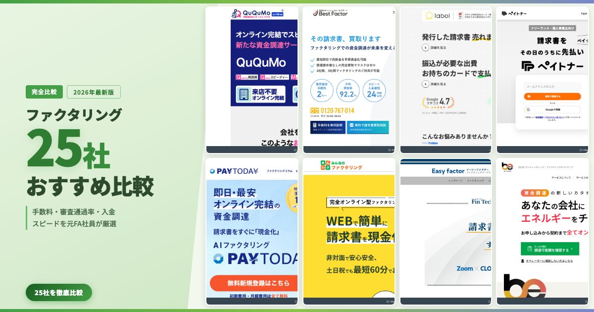 ファクタリング業者25社を独自7軸(手数料・審査通過率・入金スピード・個人事業主可否・確定申告不要・買取金額・おすすめ用途)で比較。元FA会社社員が「本当に使える業者」を選んだ基準を公開。
