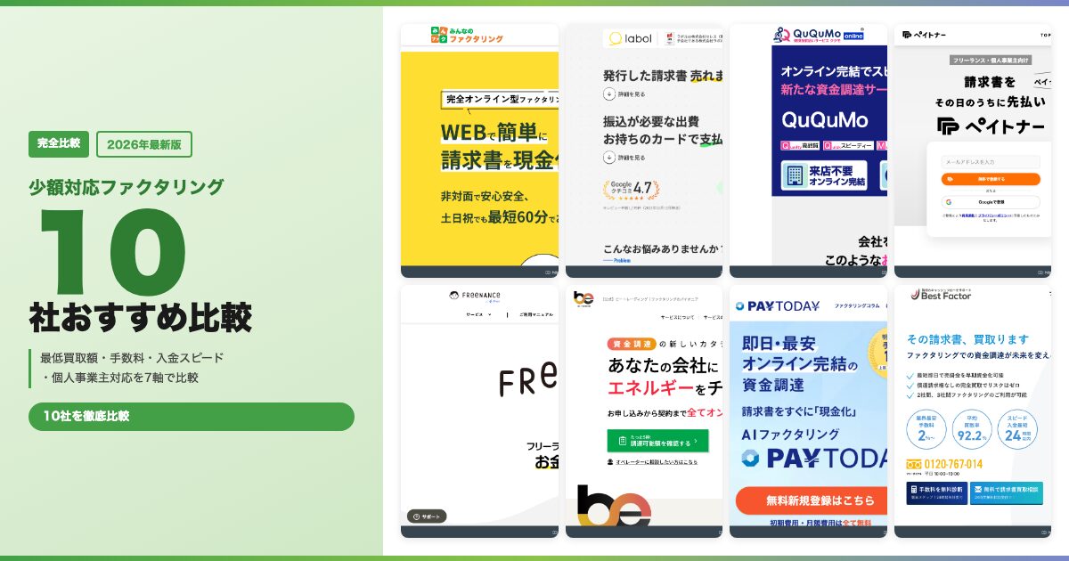 少額の売掛金を現金化できる11社を、最低買取額が低い順に紹介します。それぞれの強み・手数料体系・利用時の注意点を解説します。
