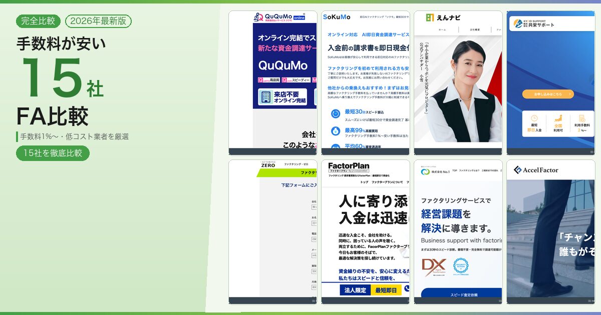 本記事では16社を手数料下限の低い順に並べて比較しました。法人向けで最安を追うならアクセルファクター・ファクタープラン、個人事業主向けではえんナビ・QuQuMoが低水準の手数料を維持しています。いずれも申込前に他社との比較見積を行い、競合の数字を交渉の武器にすることで実質的な手数料を引き下げることができます。