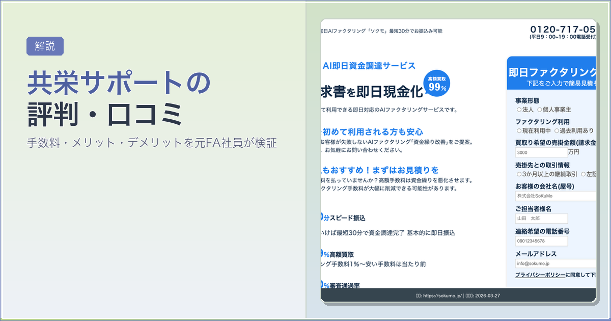 結論から言えば、共栄サポートは審査通過率95%以上・最短即日入金のオンライン完結型ファクタリング会社です。ただし原則法人限定で口コミ数は少なめです。この記事では、共栄サポートのメリット・デメリット・口コミを徹底検証します。
