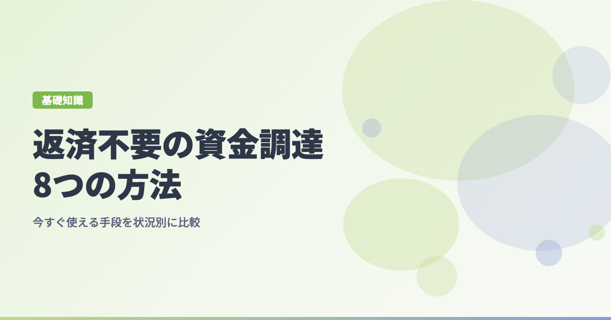 「銀行に断られた」「これ以上借入を増やしたくない」。そんな状況で選べる返済不要の資金調達は8種類あり、仕組みも入金スピードもまったく異なります。この記事では8手段を比較し、緊急度・売掛金の有無・事業規模別の選び方まで解説します。