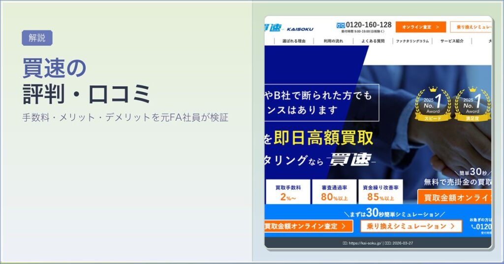 買速(かいそく)の手数料2〜10%・最短30分入金の実態を検証。スピード特化型ファクタリングの強みとデメリット、同社運営SoKuMoとの違いまで。 -