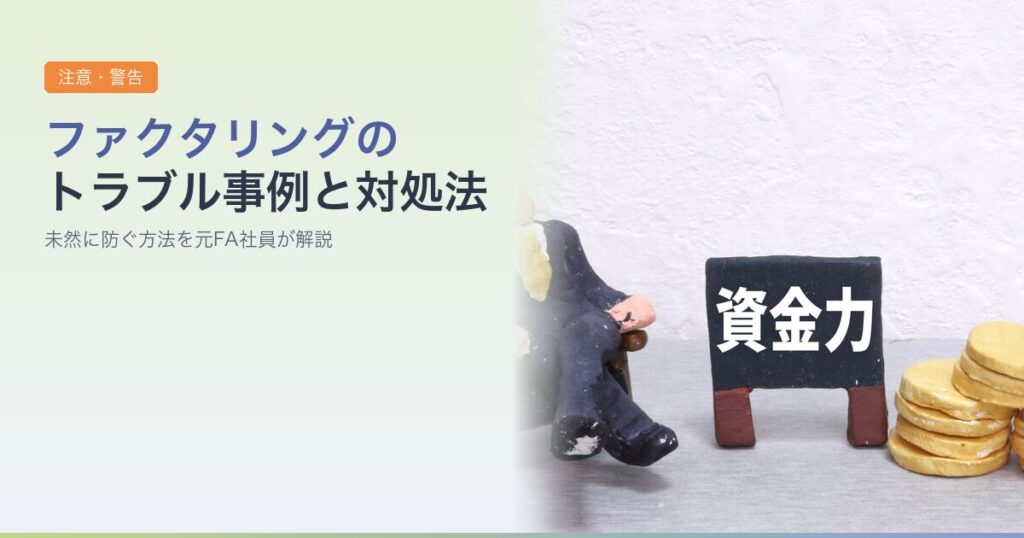 ファクタリングのトラブル事例と対処法を解説。契約書の見落としや悪質業者の見分け方、未然に防ぐ5つのポイントを元FA社員が詳しく説明します。 -