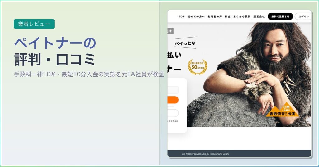 ペイトナー(旧ペイトナーファクタリング)の評判・口コミを元FA社員が検証。手数料一律10%・最短10分入金・freee連携の実態、利用者の本音、QuQuMoとの比較まで解説。 -