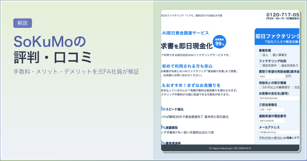 SoKuMoの手数料1〜15%・AI審査・最短30分入金の実態を検証。同社運営の買速との違い、QuQuMo・ラボルとの比較まで。