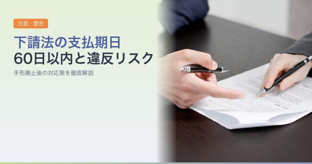 下請法の支払期日60日ルールと2026年手形廃止への対応を解説。違反リスクと罰則、振込への切り替え方法、下請け事業者が知っておくべき権利をわかりやすく説明します。 -